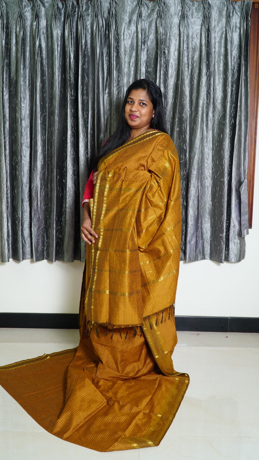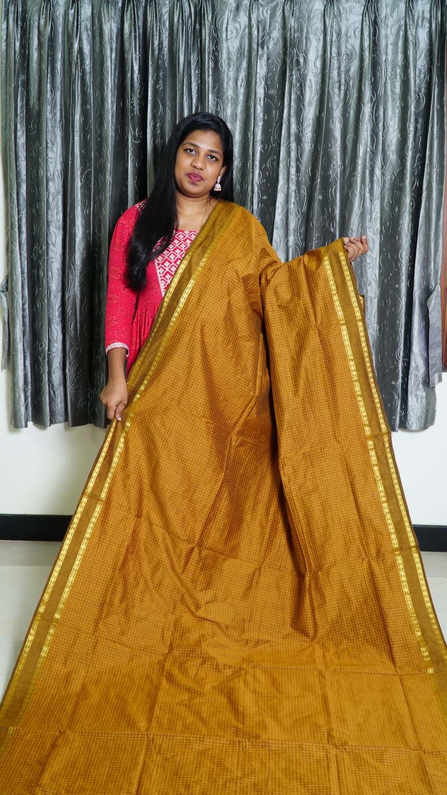 Crafted from 100% acrylic cotton, this saree combines the breathability of cotton with enhanced durability — no shrinkage, no color fading, and easy maintenance. Its crisp drape and lightweight feel make it ideal for temple wear, cultural gatherings, and everyday elegance.