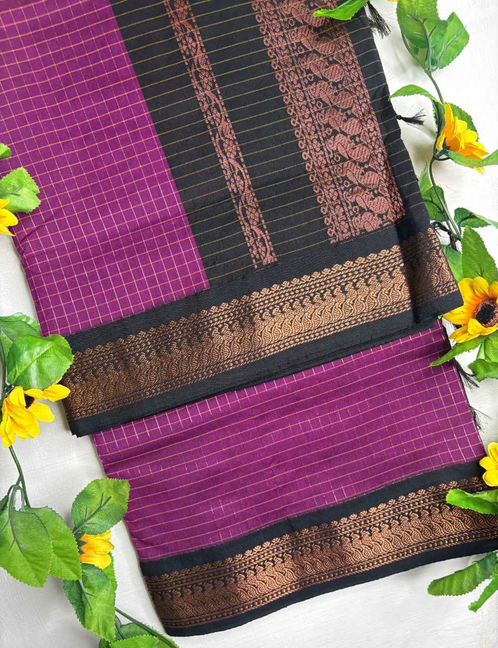 This saree feels regal and artistic with its violet body woven in delicate checks. The jewel tone radiates richness, making it a striking choice for evening pujas, festive gatherings, and cultural events.