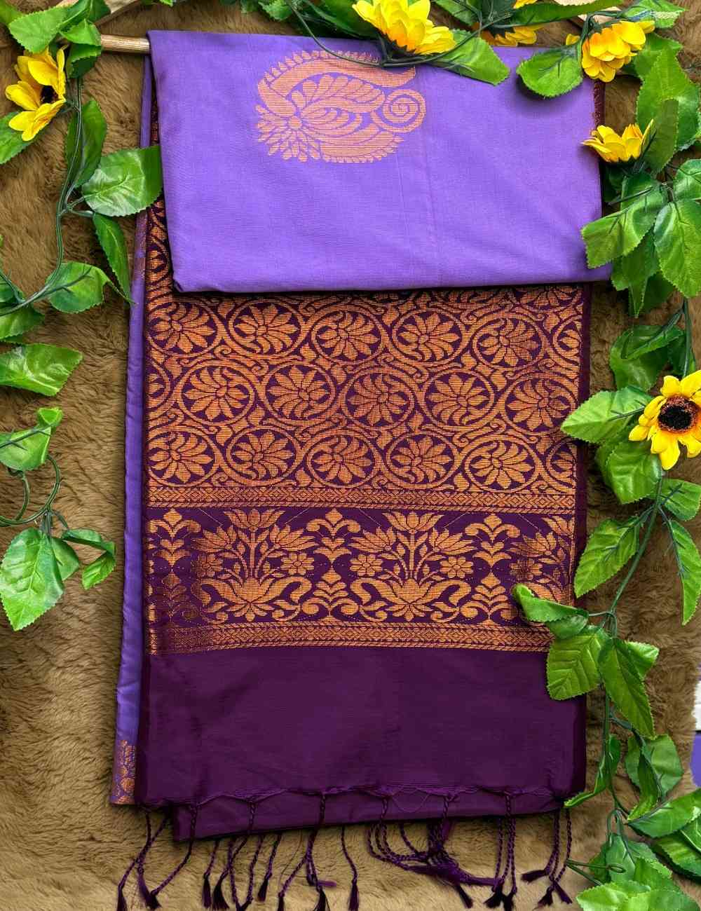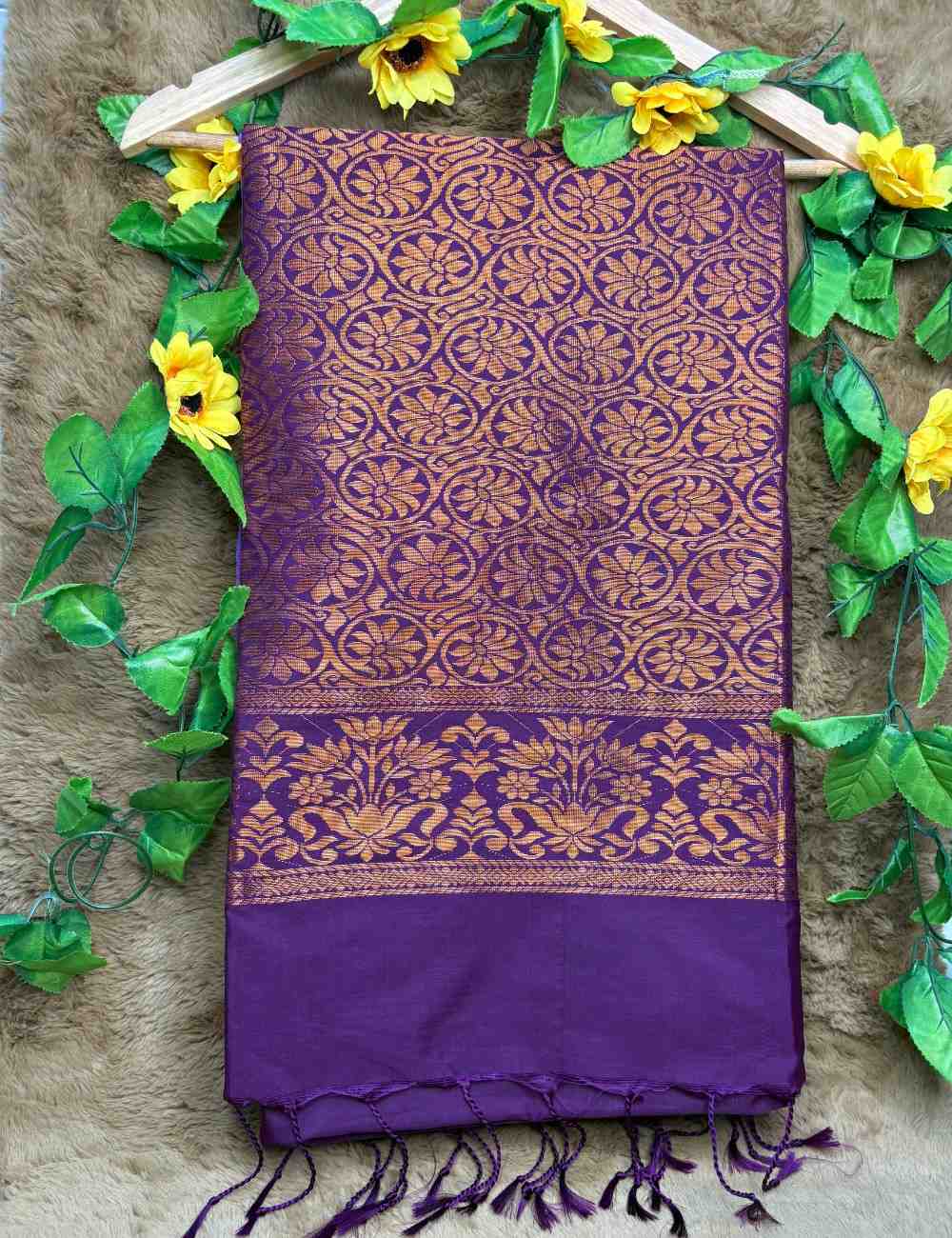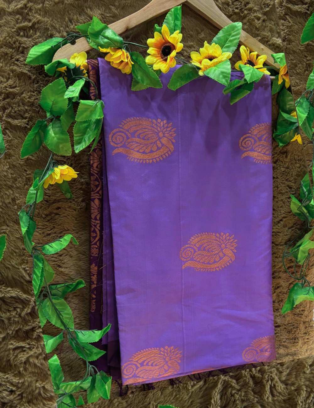 This saree celebrates tonal layering and traditional finesse. The violet body is embroidered with copper motifs — a single paisley on the upper section and dense floral-geometric patterns below. The pallu and blouse shift into a deeper dual-tone grape shade, adding richness and contrast while maintaining harmony.