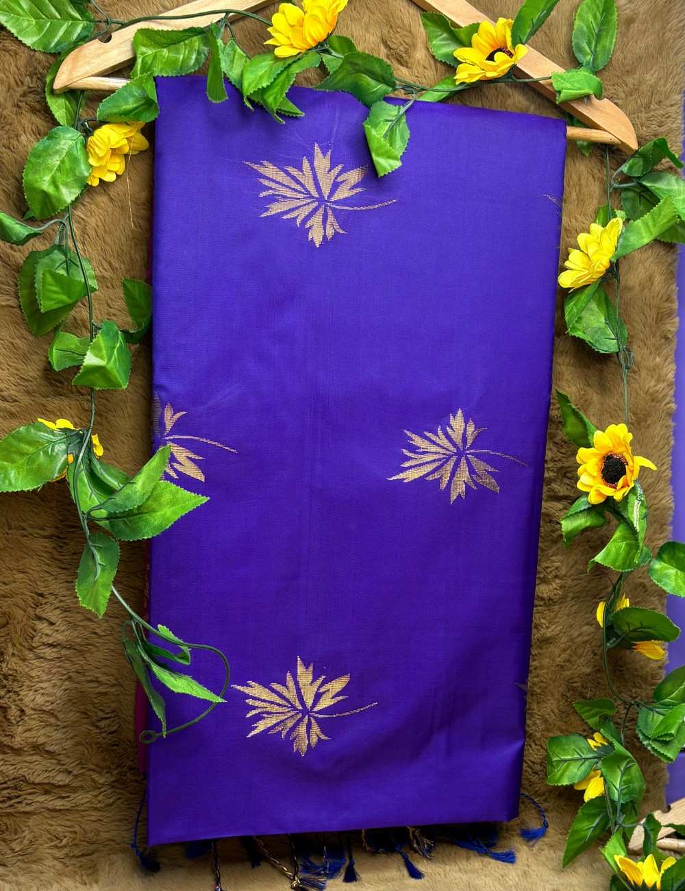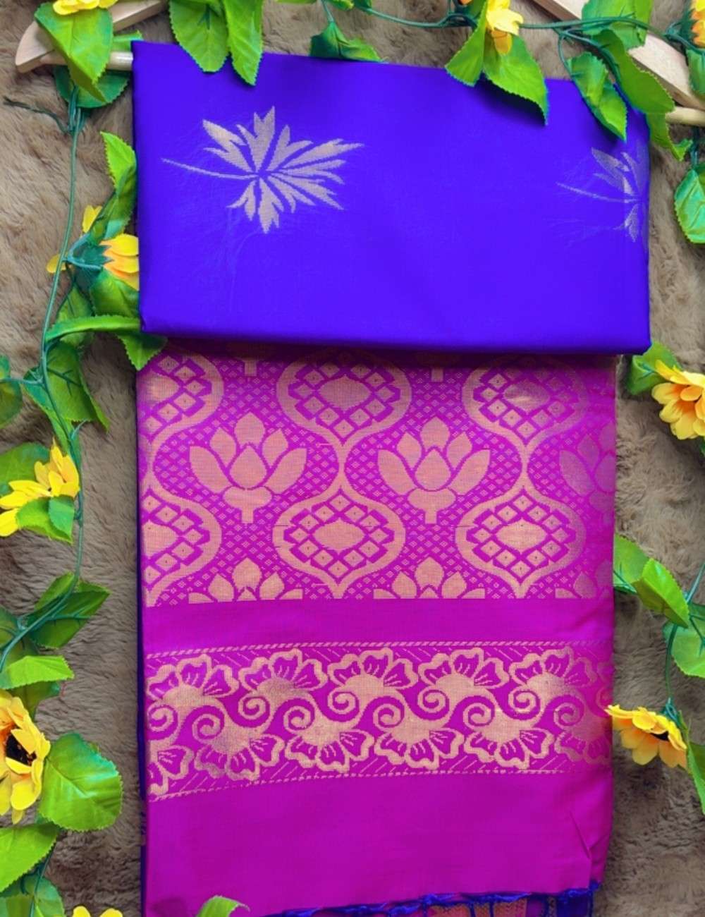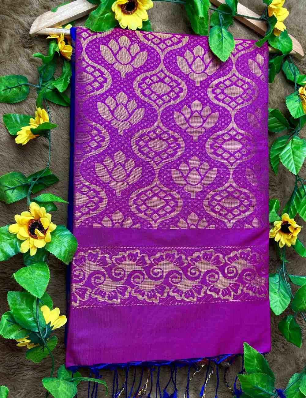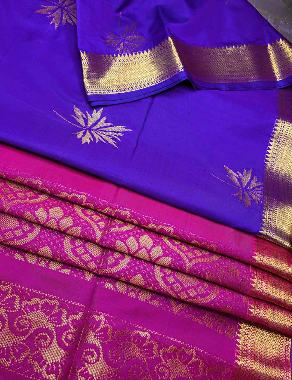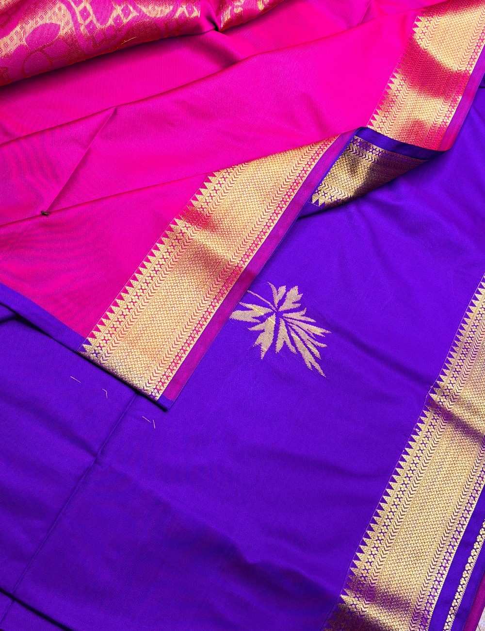 This saree celebrates jewel-toned richness and traditional artistry. The violet body glows with golden floral detailing, exuding depth and sophistication. The pink pallu and blouse introduce a lively counterpoint, showcasing elaborate geometric and ornamental zari patterns.