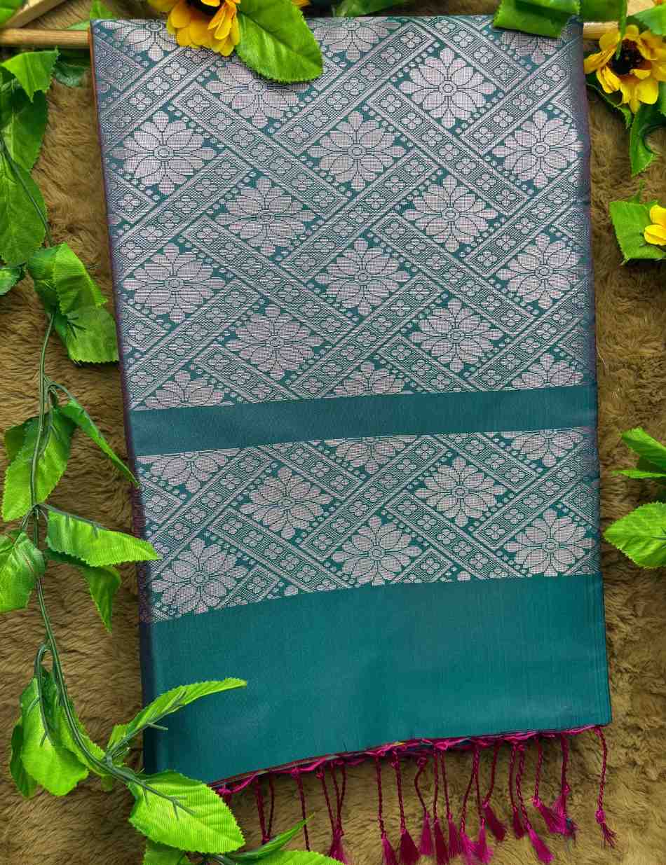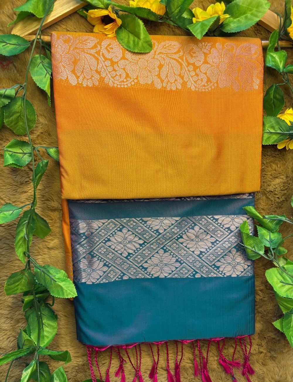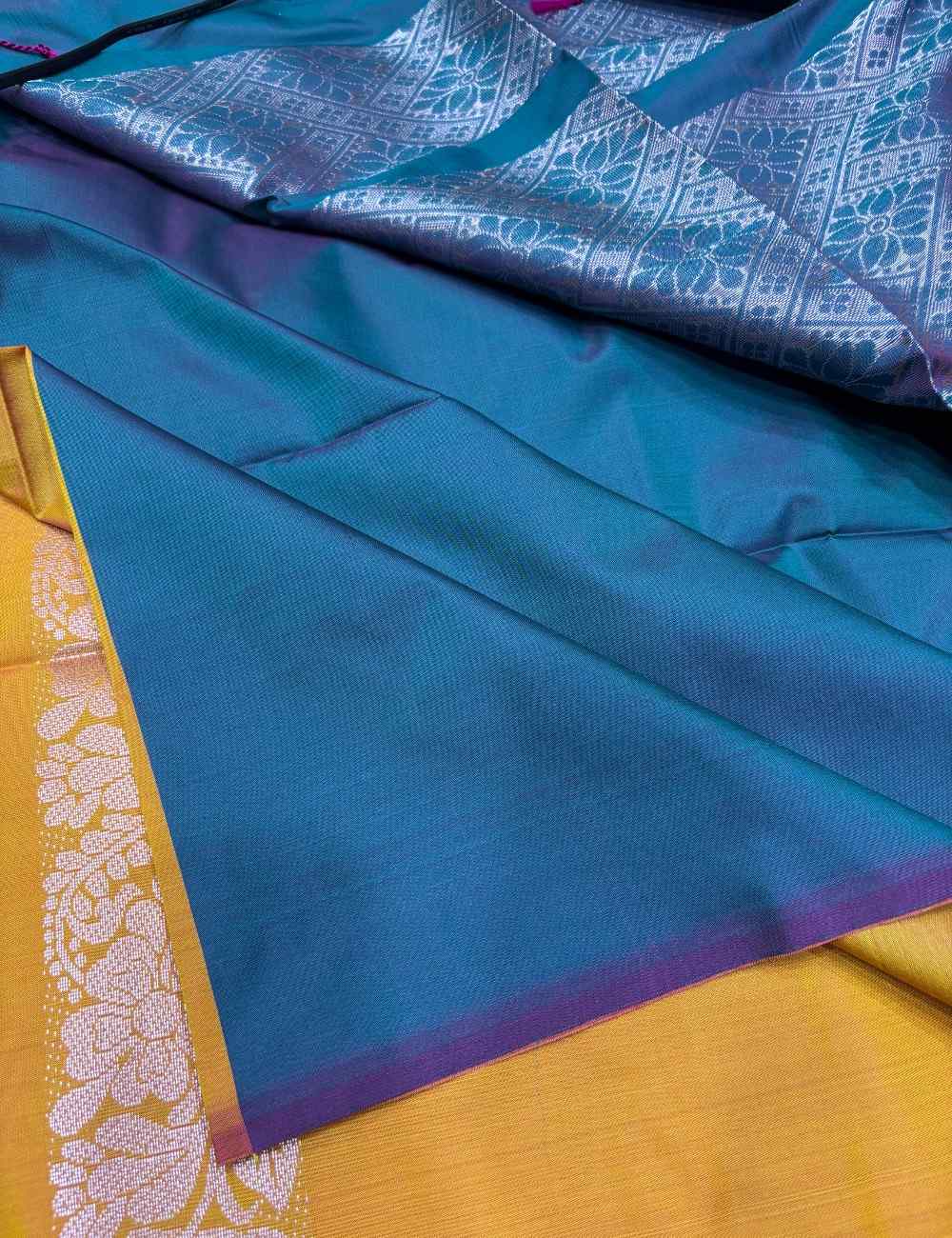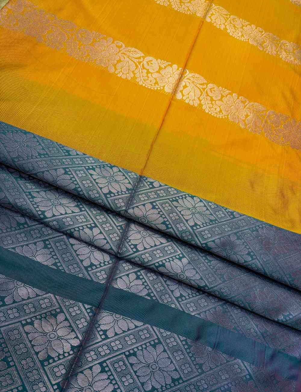 This saree celebrates luminous contrast and intricate craftsmanship. The yellow body glows with gold floral detailing, exuding warmth and festivity. The deep teal pallu and blouse introduce a jewel-toned richness, woven with silver motifs in floral and grid-like geometric patterns.